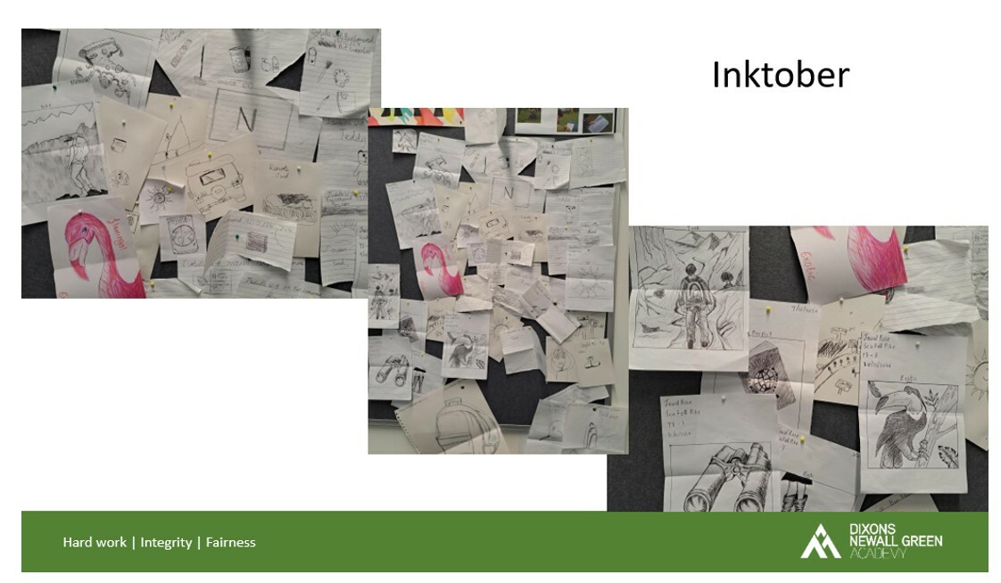 Jake Parker created Inktober in 2009 as a challenge to improve his inking skills and develop positive drawing habits. It has since grown into a worldwide endeavour with thousands of artists taking on the challenge every year. Students are DNG joined the challenge and did not disappoint with their inktastic creations!