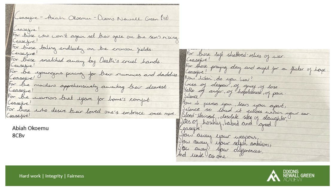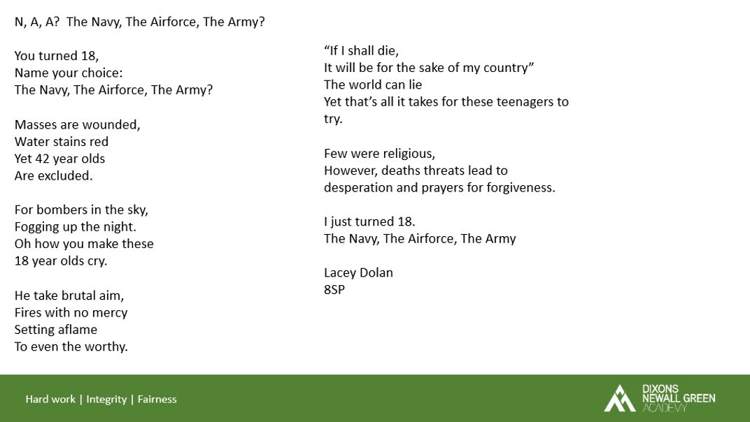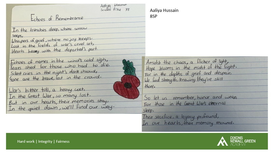 In November this academic year, students at DNG had the opportunity to enter the ‘Young Writers’ competition, writing a poem in remembrance of fallen service people across the world. A national competition, every student will have the opportunity to see their story published in a book! We were so impressed with our entries. See some of our entries below: